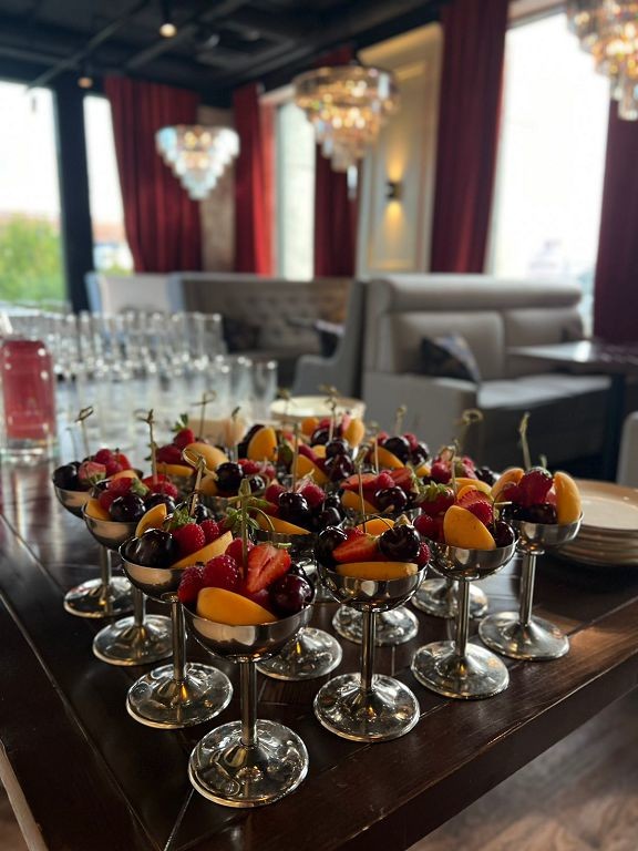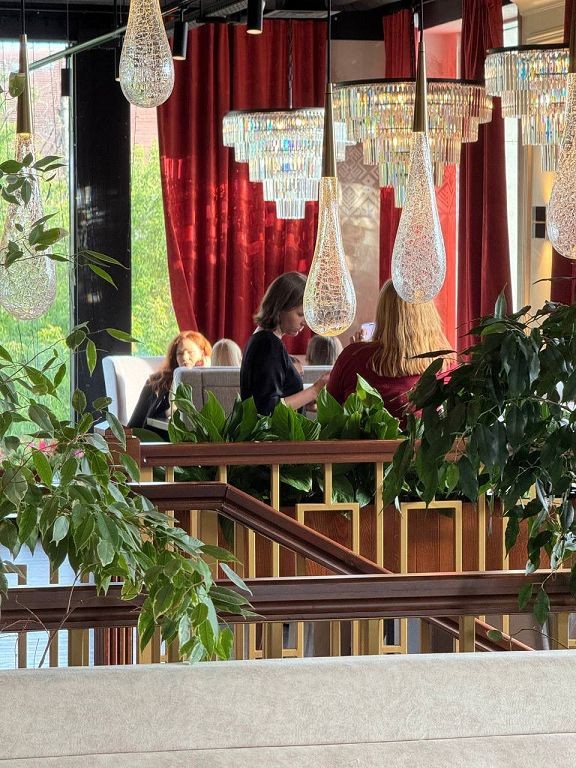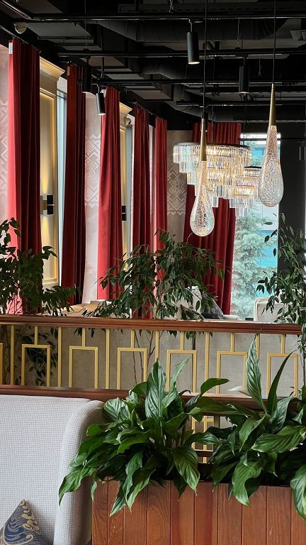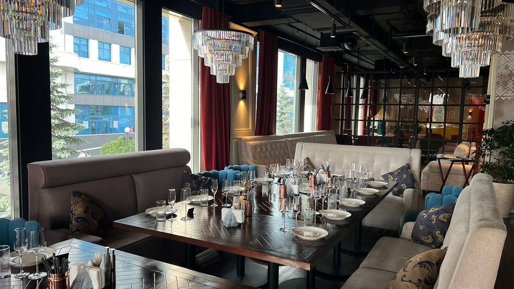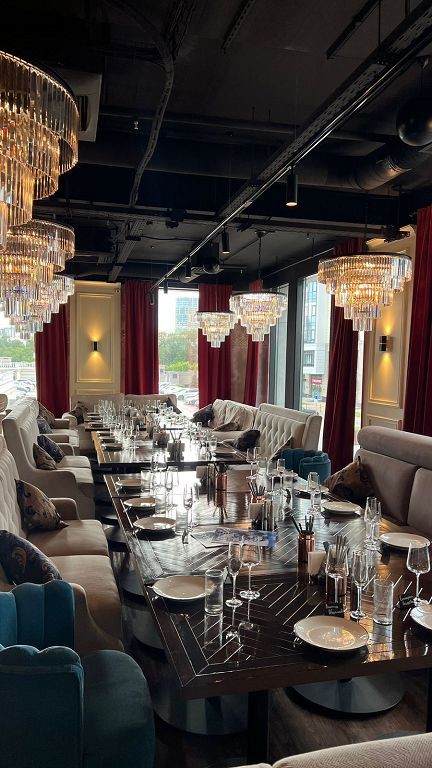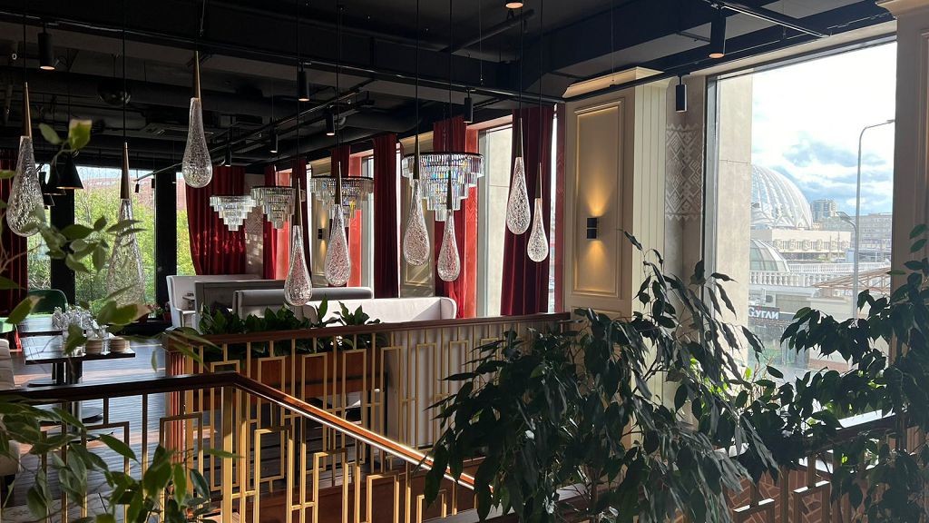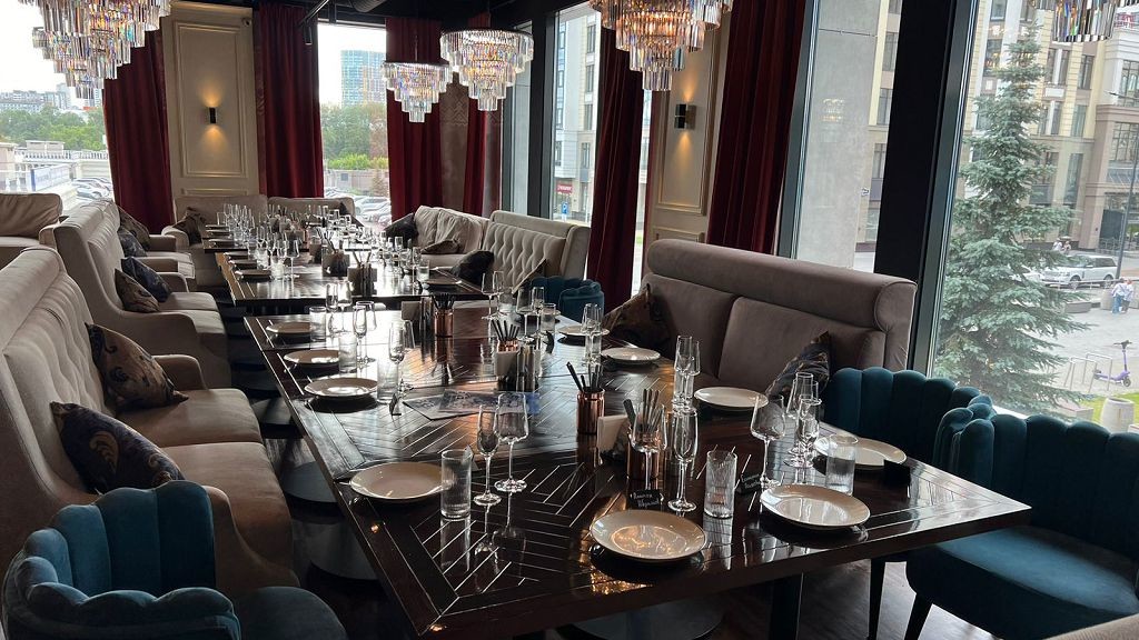 В ресторане царит приятная атмосфера: стильный интерьер, панорамные окна с видом на город, расслабляющая музыка. Для маленьких гостей предусмотрен уютный детский уголок.
